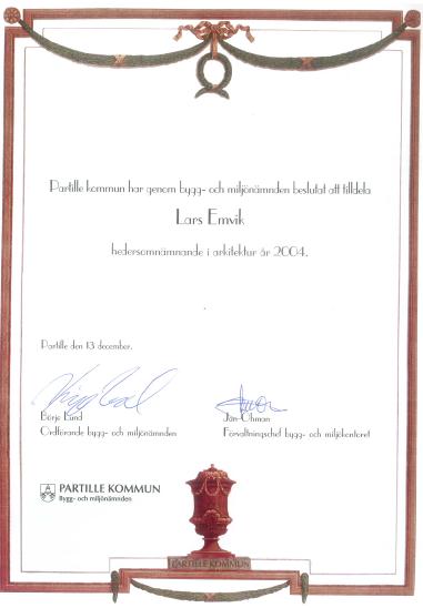 Lars Emvik har erhållit Partille kommuns hedersomnämnande i Arkitektur med motiveringen: